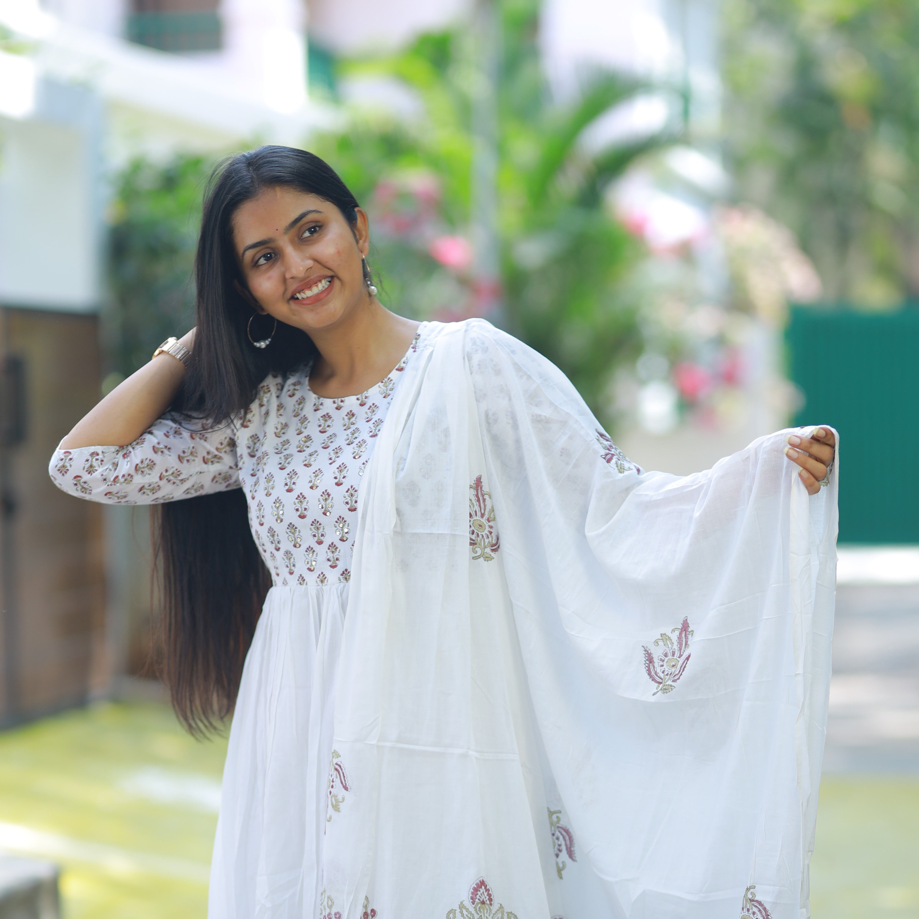 ₹300 off (-13%)White Mul Cotton Block Print 3Pc Umbrella Kurta Set